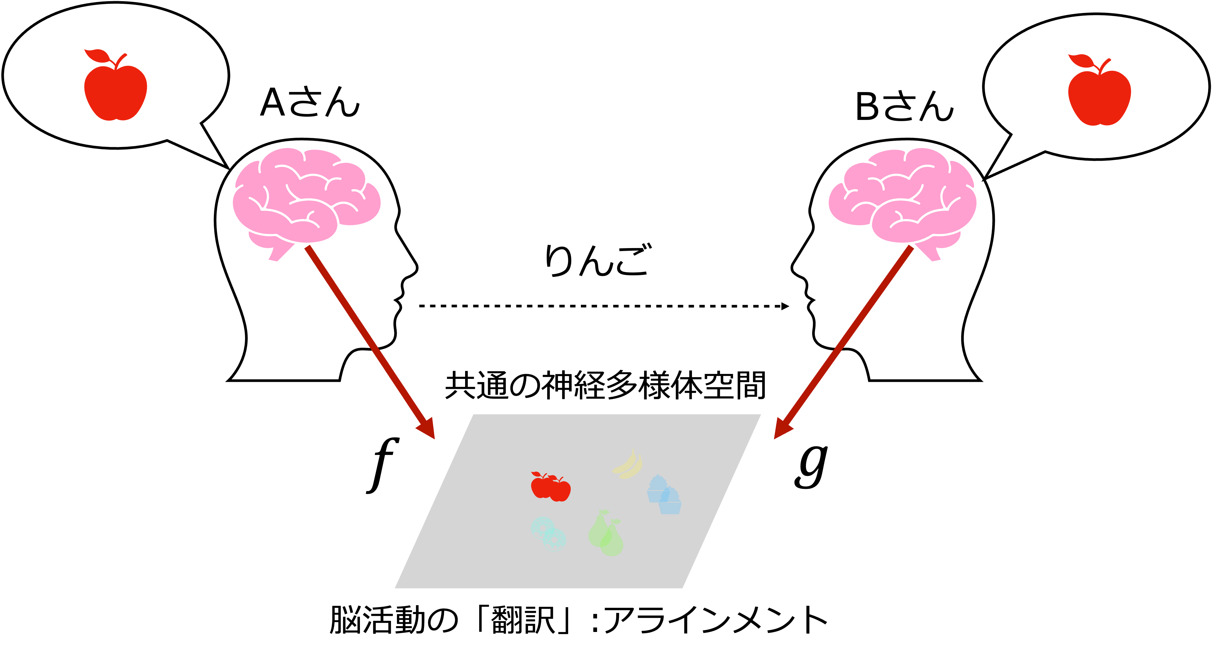 脳と脳との直接的な情報伝達の実現には、単に個別の脳ごとに情報を読み取るだけでなく、異なる脳の間での情報の対応づけ、「翻訳」の技術が必要です。2つの脳活動の対応関係を取る方法としては、2つの脳活動で共通の神経多様体空間に射影して、その射影した空間で対応する活動がなるべく近くなるように「揃える」(アラインメント)という操作を行う方法があります。数学的には、AさんとBさんの対応する脳活動をそれぞれ、共通の空間への射影をとした時、との距離がなるべく小さくなるようにアラインメントする行列を求める最適化問題()になります。