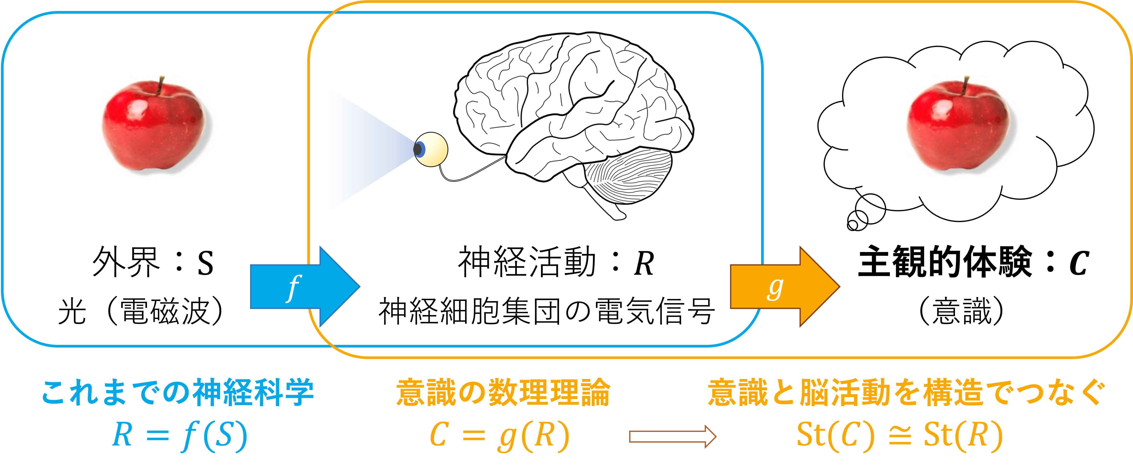 本研究室は「意識」(主観的な体験)の数学的な理論を構築することを大きな目標としています。従来の神経科学では、外界の刺激(例えばリンゴという視覚刺激)に対して、どのような脳活動が生じるかという変換則を研究してきました。この変換則をと書くと、関数を明らかにすることが、従来の神経科学が主にやってきた研究であると言えます。一方、意識の理論が明らかにすべきなのは、神経活動とそれによって生じる意識との間の変換則、数式で書くとすればという関係式です。